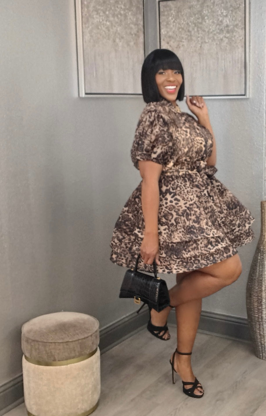 Fit: Fabulously fun, can be styled in multiple waysSize: Model is wearing LDetails: Button-down front, collar, ribbon tie belt for adjustable waist