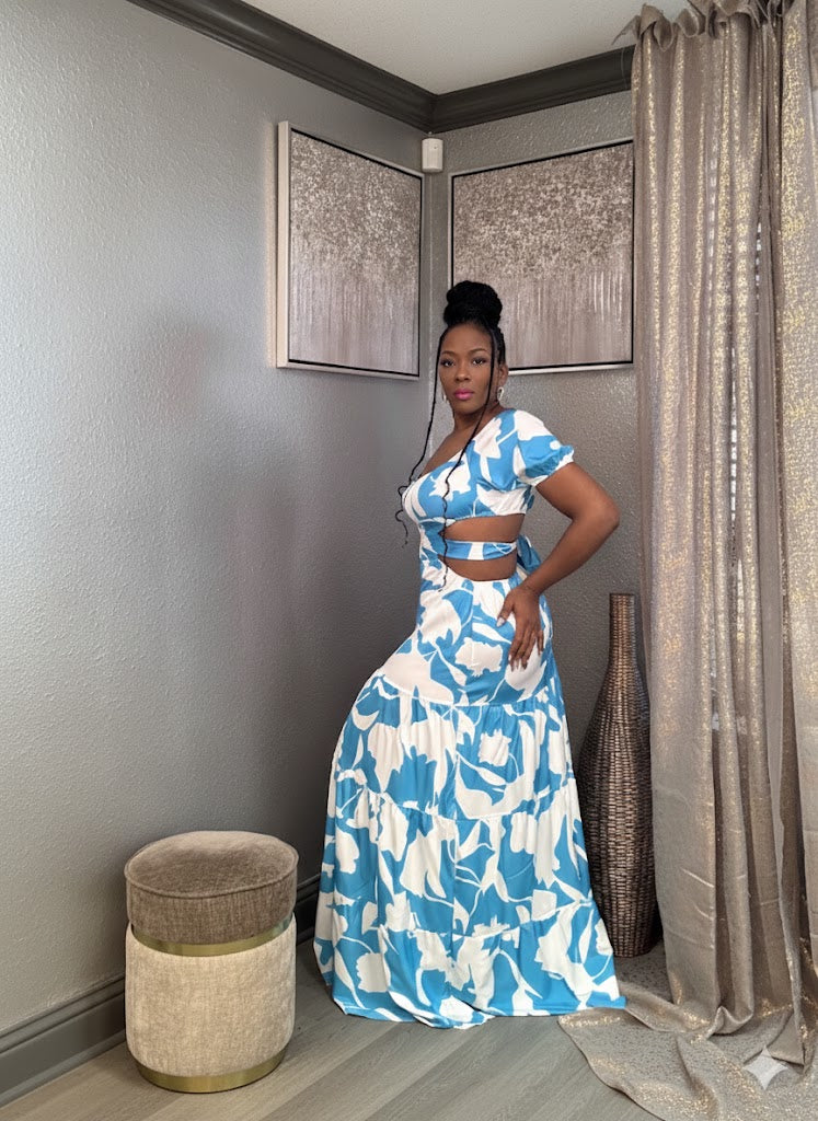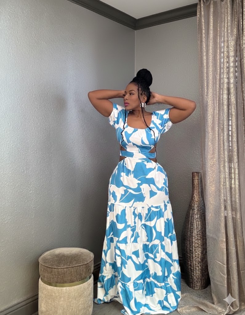 Details: Blue and white floral dress featuring an open back with a tied bow for an adjustable and feminine finish